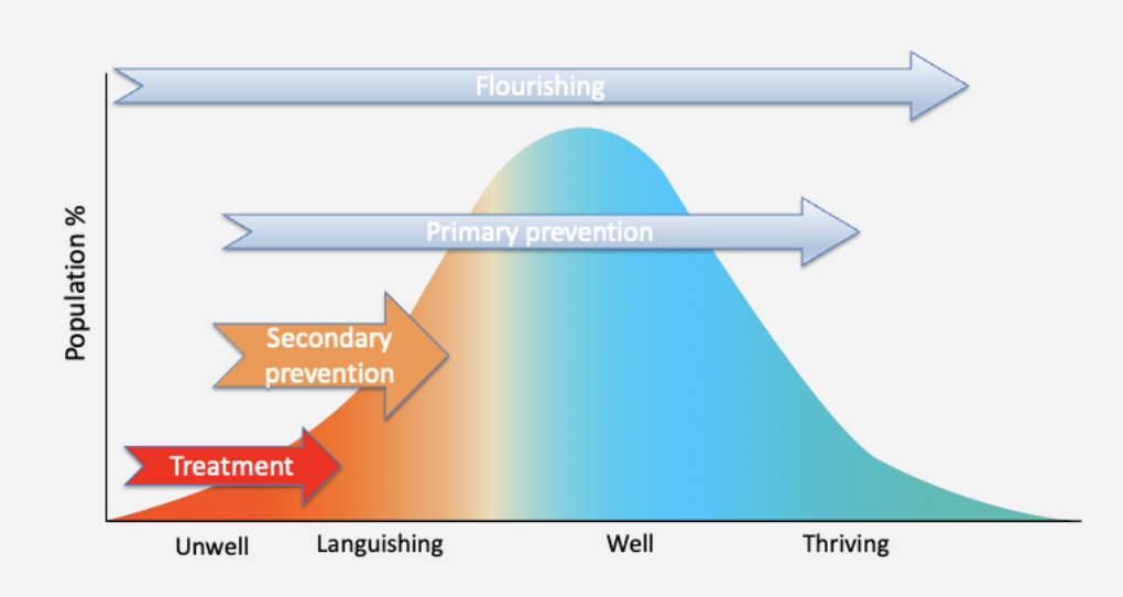 This diagram illustrates the spectrum of care from treatment through secondary and primary prevention to flourishing. It emphasizes a population-level approach, with mindfulness supporting each phase—not only for recovery but for lifelong well-being.