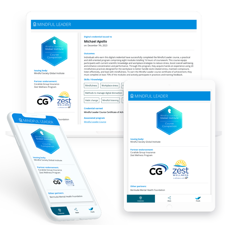Participants who complete the program requirements receive a digital certificate recognizing advanced learning in workplace mindfulness, resilience, stress reactivity, communication, and leadership performance.